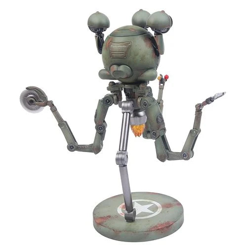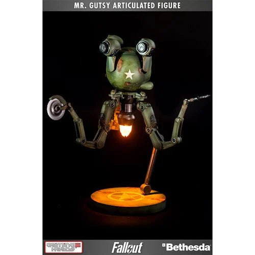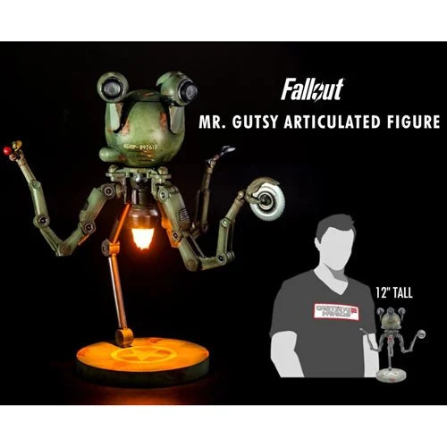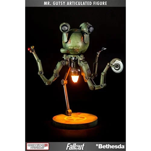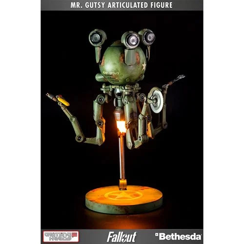 Take down those bad Commies with this Gaming Heads Fallout Mr. Gutsy Deluxe Articulated Action Figure with Sound. It's made of quality PVC and features over 40 points of articulation, authentic in-game sounds and speech, a glowing LED exhaust flame, and motorized sound-activated head rotation! Mister Gutsy is a dedicated combat robot with military olive-drab paint job and WWII-era U.S. Army roundel insignia. The figure plays 18 random Mr. Handy soundtracks and has working apertures on the eyes! The built-in rechargeable battery can be recharged via USB. Mr. Gutsy measures about 12-inches tall x 5-inches wide x 5-inches long with arms folded in. Fallout fans do not want to miss this!