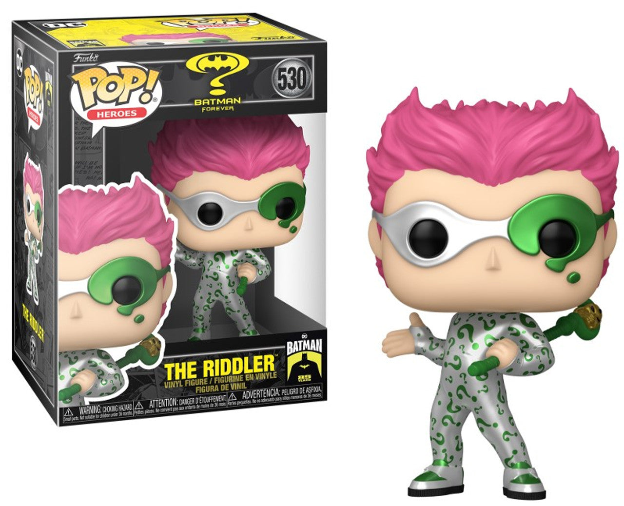 Solve a puzzle with the most quizzical villain around, The Riddler! Celebrate 85 Years of Batman when you welcome him to your Batman Forever Funko Pop! collection. This Batman Forever The Riddler Metallic Funko Pop! Vinyl Figure #530 measures approximately 4-inches tall and comes packaged in a window display box. For ages 3 and up.