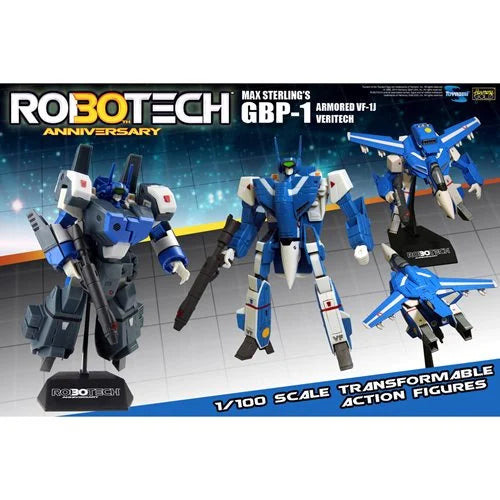 Your long wait is over! Long-awaited by fans, this Robotech 1:100 scale GBP-1J Heavy Armor Veritech Transformable Action Figure is definitely a must-have! The Robotech 30th Anniversary Max Sterling's GBP-1J Heavy Armor Veritech Transformable Action Figure (Blue) stands approximately 6-inches tall, fully articulated, can be converted into Fighter, Battloid, or Gerwalk modes. Ages 14 and up.